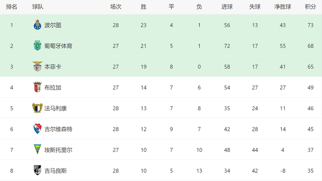 事实上,排名第三的本菲卡,也看到了希望。目前他们少赛1场,落后波尔图8分,随后如果能在客场战胜卡萨皮亚,本菲卡和榜首的差距就将变成5分,他们依然存在翻盘的可能性。
